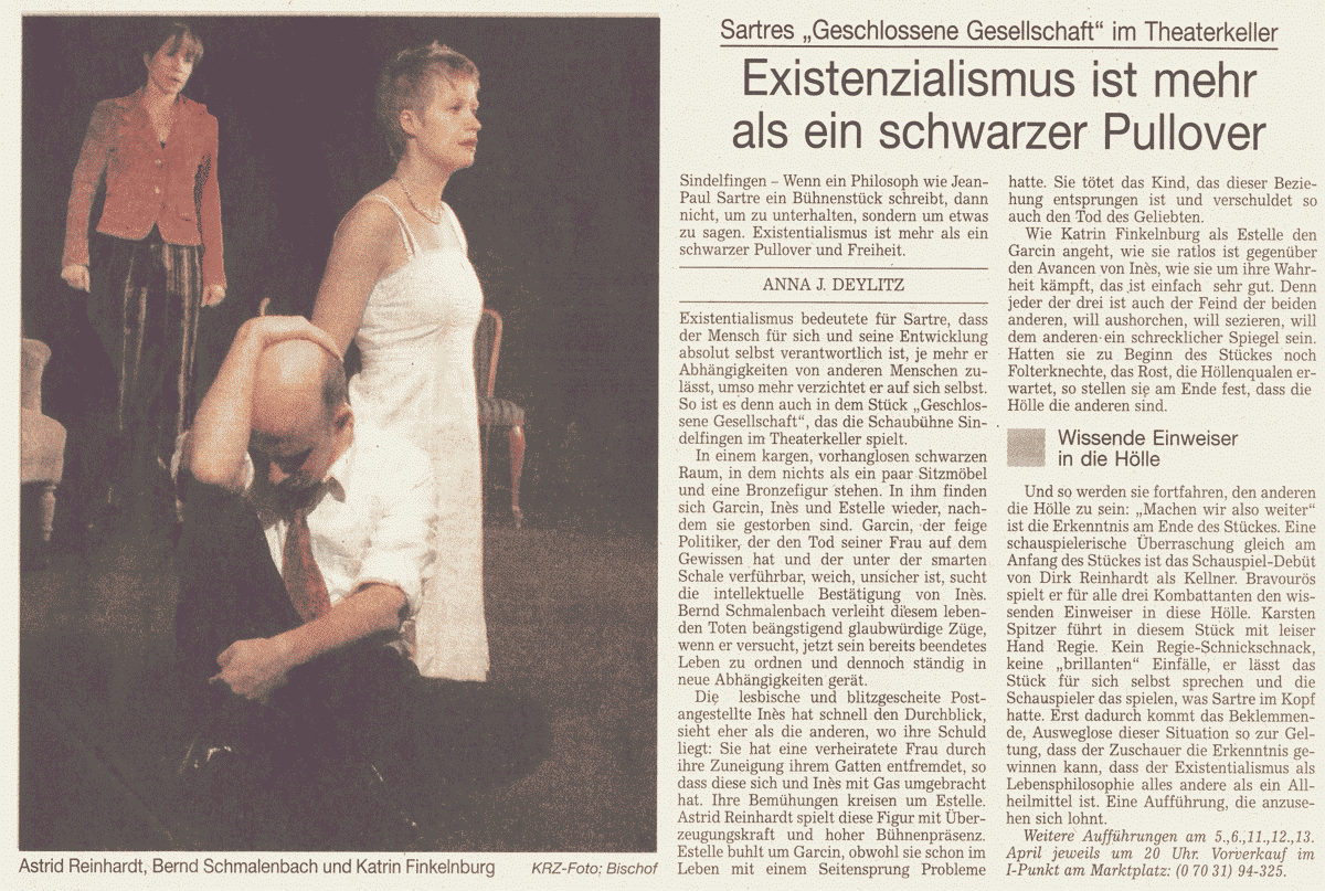 | Existenzialismus ist mehr als ein schwarzer Pulluver Kreiszeitung Böblinger Bote vom 7. April 2008 (Anna J. Deylitz) |