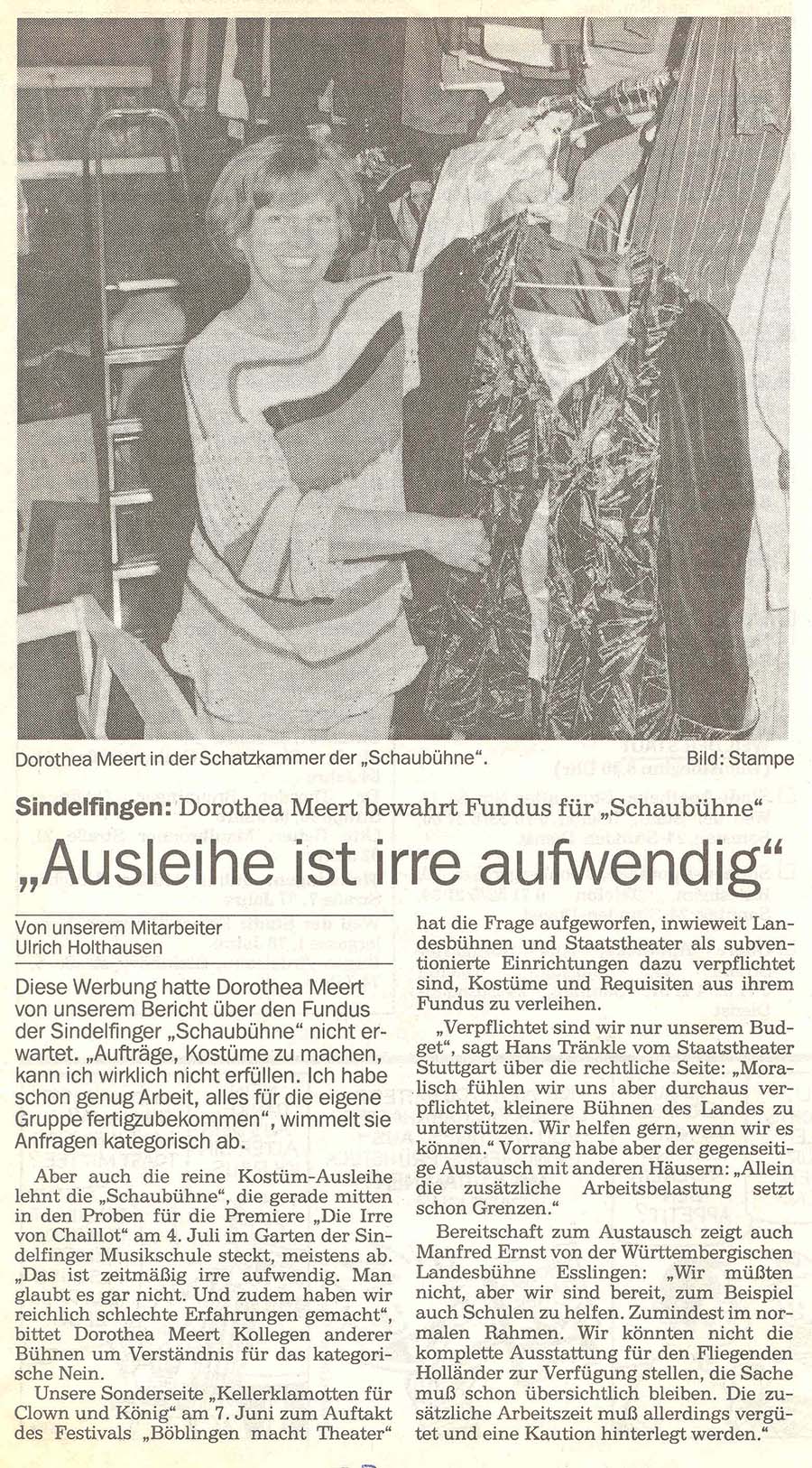 | Kultur Lokal: Dorothea Meert bewahrt Fundus für "Schaubühne" "Ausleihe ist irre aufwendig" SZ/BZ vom 28. Juni 1997 (Ulrich Holthausen) |