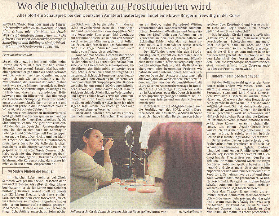 | Interview mit Gisela Samesch bei den Proben zu Dario Fos „Der Nackte und der Mann im Frack" "Wo die Buchhalterin zur Prostituierte wird" Stuttgarter Zeitung vom 18. September 2004 (Petra Mostbacher-Dix) |